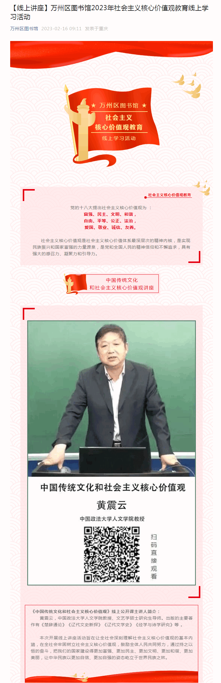 【线上讲座】万州区图书馆2023年社会主义核心价值观教育线上学习活动