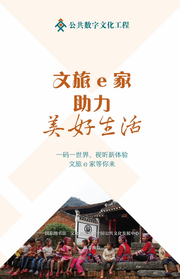 2020年春节期间,文化和旅游部全国公共文化发展中心、国家图书馆、中国文化馆学会、中国图书馆学会联合组织开展“文旅e家助力美好生活”春节服务活动,活动以文旅e家应用程序为服务平台,精选了近千种群众喜爱的文化精品资源,提供基层群众免费扫码获取。同时,通过线下海报配发方式,进一步丰富和活跃春节期间群众文化生活,方便群众就近便捷享受服务。