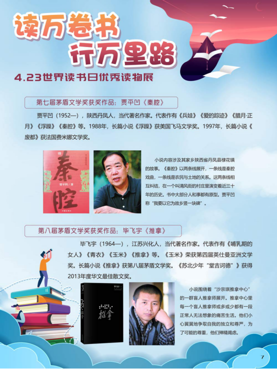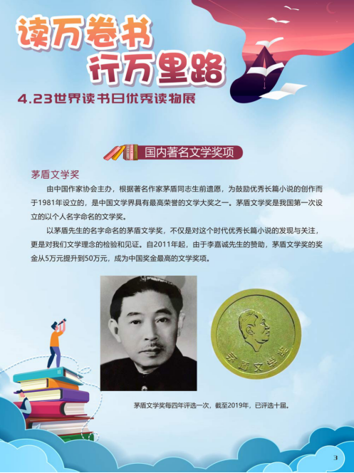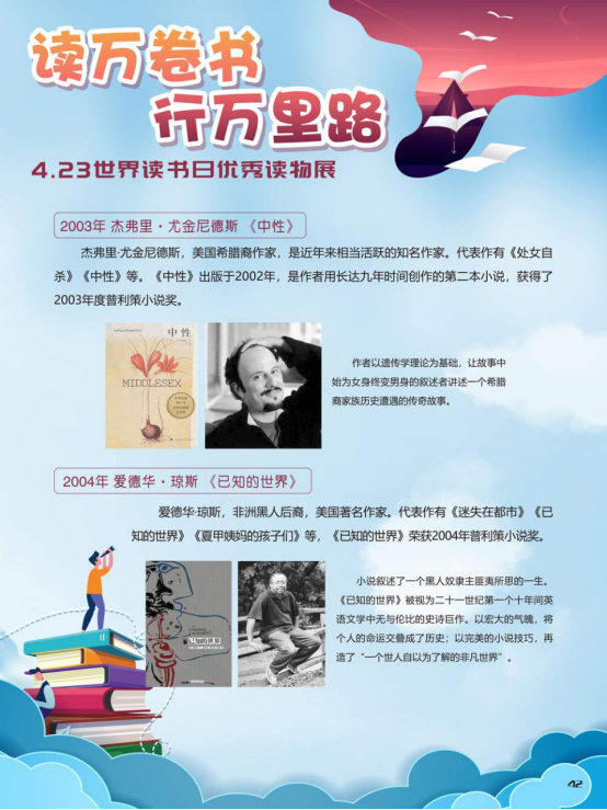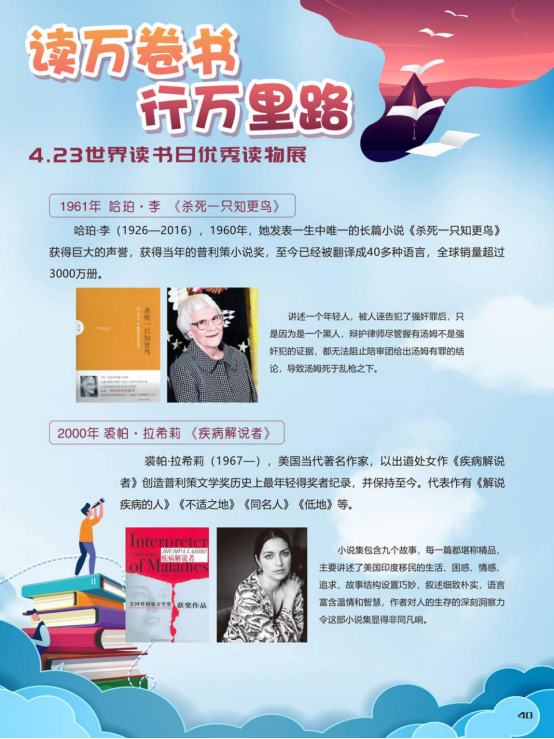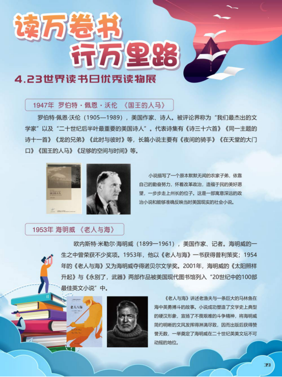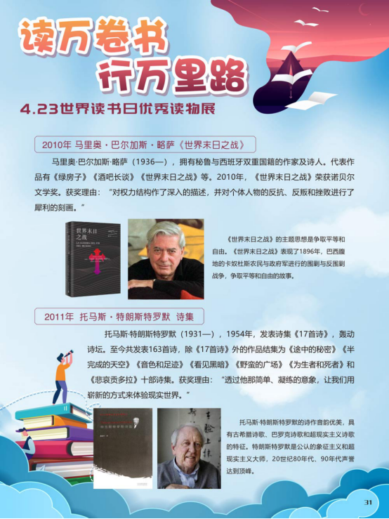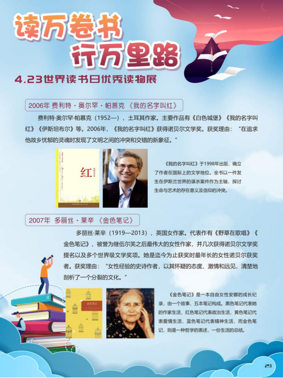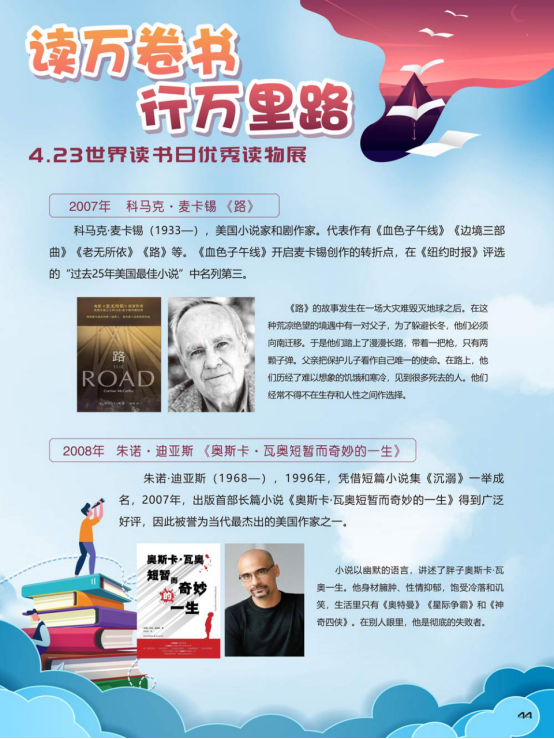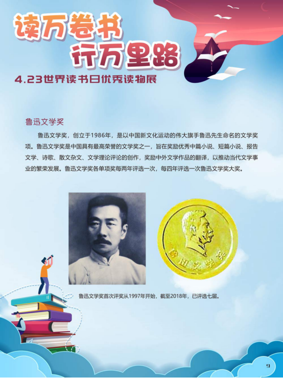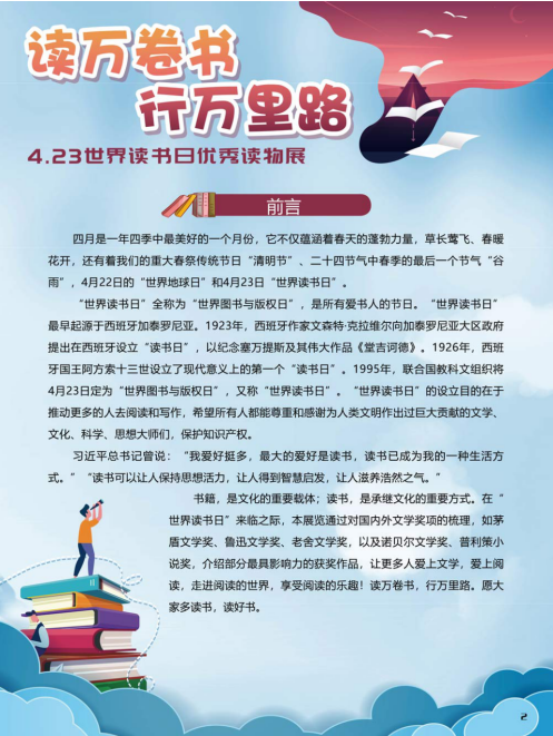 “世界读书日”全称为“世界图书与版权日”,是所有爱书人的节日。“世界读书日”最早起源于西班牙加泰罗尼亚。1923年,西班牙作家文森特·克拉维尔向加泰罗尼亚大区政府提出在西班牙设立读书日,以纪念塞万提斯及其伟大作品《堂吉诃德》。1926年,西班牙国王阿方索十三世设立了现代意义上的第一个读书日。1995年,联合国教科文组织将4月23日定为“世界图书与版权日”,又称“世界读书日”。“世界读书日”的设立目的在于推动更多的人去阅读和写作,希望所有人都能尊重和感谢为人类文明做出过巨大贡献的文学、文化、科学、思想大师们,保护知识产权。