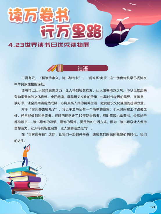 读书可以让人保持思想活力,让人得到智慧启发,让人滋养浩然之气。中华民族历来有勤学善学的文化传统。全民阅读,既是历史文化的传承,也是时代发展的需要。多读书、读好书,让全民阅读蔚然成风,必将点亮人民的精神生活,激发建设文化强国的磅礴力量。“世界读书日”之际,让我们一起翻开书页,愿智慧的阳光照亮我们的时代、我们的人生。